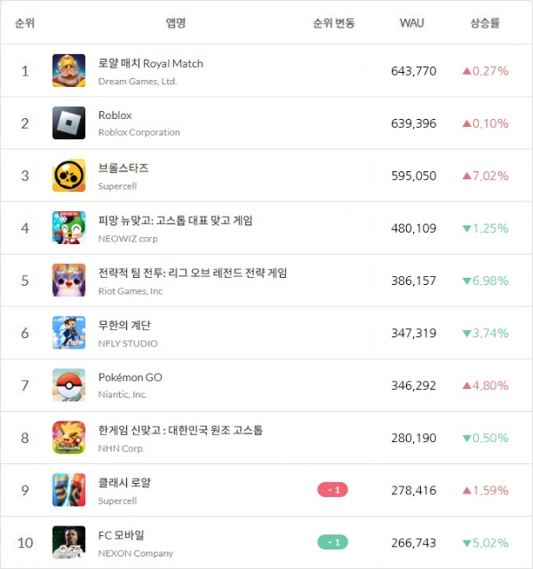 WAU 톱10 게임 중 8위까지 순위 변동이 없었던 가운데 슈퍼셀 '클래시 로얄'과 넥슨 'EA 스포츠 FC 모바일'이 9위 자리를 두고 경쟁을 벌이고 있다. 11위는 WAU 22만7609명을 기록한 플레이릭스 '꿈의 정원'이었다.