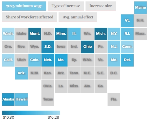 비즈니스인사이더에 따르면 미국의 싱크탱크 경제정책연구소(EPI)는 이날 발표한 보고서에서 22개 주정부가 지난해 주의회에서 통과된 최저임금 인상 법안과 물가를 반영한 최저임금 조정 등에 따라 이날부터 최저임금 인상에 나서는 것으로 파악됐다고 밝혔다.