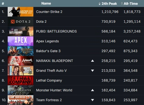 최다 동시 접속 게임 순위를 살펴보면 톱10 게임의 면면은 크게 변화하지 않았다. 스팀 운영사 밸브 코퍼레이션의 '카운터 스트라이크 2'와 '도타 2', 크래프톤의 '펍지: 배틀그라운드(배그)' 등 톱5 게임 간에는 순위 또한 바뀌지 않았다.