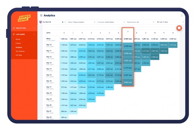 또한 새롭게 개편된 슈퍼소닉의 '모든 게임 페이지'에서 채널 및 코호트 기간별로 나누어진 CPI, 게임 플레이 시간, 잔존율, ARPU 등 기타 30개의 지표 중에서 개발자가 원하는 KPI를 선택할 수 있다.