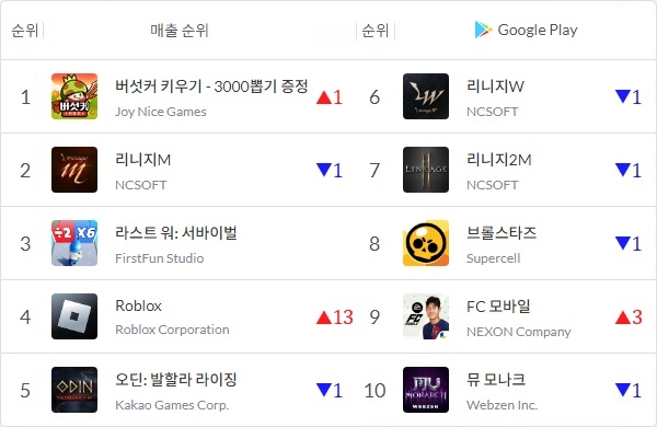 중국 게임사 4399의 자회사로 알려진 조이 나이스 게임즈의 방치형 게임 '버섯커 키우기'가 엔씨소프트(NC) '리니지M'과 1위 자리를 두고 다투고 있다. 넥슨의 'EA 스포츠 FC 모바일'이 이번 주 새로이 톱10에 올랐다.