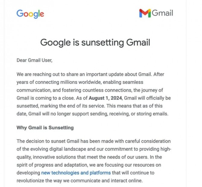 25일(이하 현지시간) 미국 경영전문지 포브스에 따르면 이 이메일의 골자는 “구글이 오는 8월 1일부로 지메일 서비스를 중단할 예정”이라는 것이다.