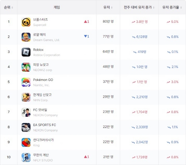 이미지 확대보기앱 통계 분석 플랫폼 모바일인덱스의 3월 3주차(11일~17일) 지표를 살펴보면 지난주 로얄 매치에 주간활성이용자(WAU) 수 1위를 빼앗겼던 '브롤스타즈'가 80만명대 WAU를 회복한 데 힘입어 1위 자리를 탈환했다.