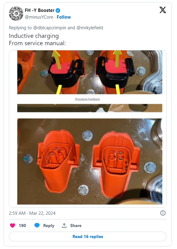 이미지 확대보기테슬라가 금명간 전기차용 무선 충전 기술을 선보일 것으로 관측됐다. 23일(이하 현지시각) 테슬라라티에 따르면 ‘FH-Y Booster'란 이름을 쓰는 테슬라 마니아는 ’비접촉식 충전(inductive charging)'에 관한 방법을 설명하는 테슬라의 최근 서비스 매뉴얼을 전날 X에 공유했다.