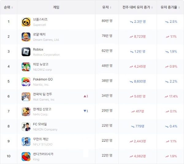 WAU 톱10 게임 변동 '제로'