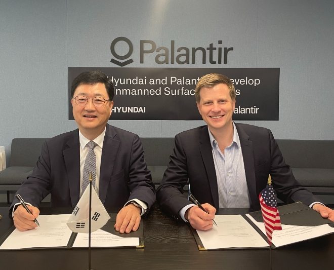 이미지 확대보기HD현대는 최근 미국 워싱턴 DC에 소재한 팔란티어 테크놀로지스 본사에서 ‘무인수상정 개발을 위한 양해각서(MOU)’를 체결했다고 14일 밝혔다.
