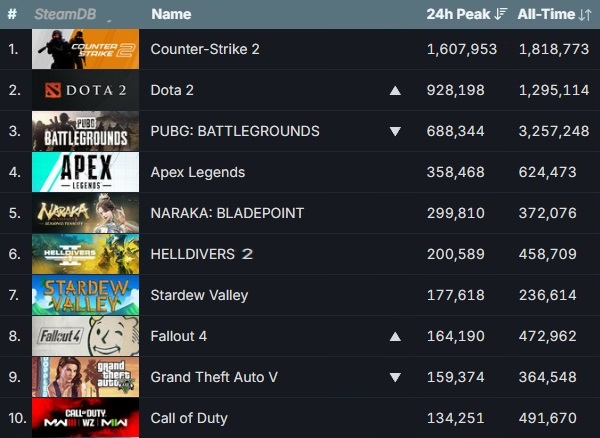 폴아웃 4가 이용자 수 8위에 오른 가운데 톱 7 게임의 면면에는 변화가 없었다. 지난주 크래프톤 '펍지: 배틀그라운드'에 2위를 내줬던 밸브 코퍼레이션 '도타 2'는 19일 '왕권의 몰락' 업데이트 예고 후 복귀 이용자가 몰리며 2위 자리를 탈환했다.
