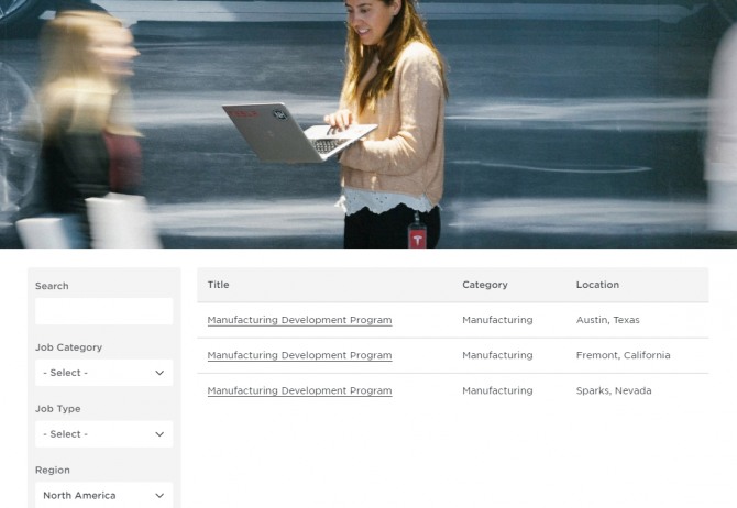 미국 텍사스주 본사의 생산직 1건, 캘리포니아주 프리몬트 공장의 생산직 1건, 네바다주 스파크스 공장의 생산직 1건이 전부다.