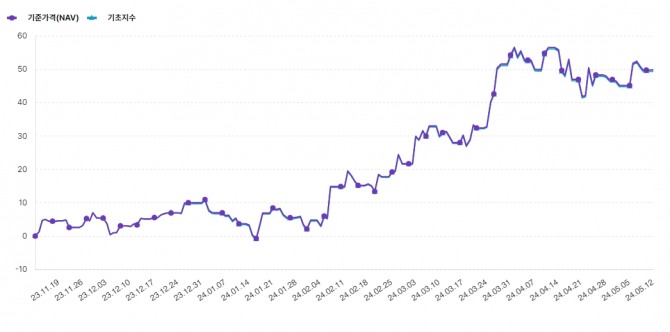 지난 13일 기준 이 상품의 성과를 보면, 최근 3개월 25.38%, 6개월 49.9%, 상장 이후 누적 수익률은 53.62%를 기록하고 있다.