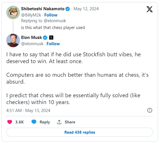 15일(이하 현지시각) 인디언익스프레스에 따르면 머스크 CEO는 지난 13일 X에 올린 트윗에서 “컴퓨터는 이제 인간보다 체스를 훨씬 잘 하는 수준에 도달했다”면서 “체커가 그랬듯이 앞으로 10년 안에 체스도 AI가 완전히 정복하게 될 것으로 예측한다”고 밝혔다.