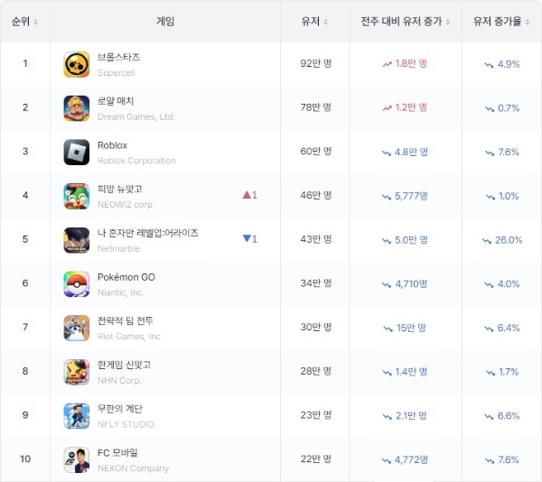 WAU 5위에 오른 나 혼자만 레벨업은 같은 주 구글 매출 1위를 차지했다. 이 외에도 슈퍼셀 '브롤스타즈'가 매출 7위, 드림 게임즈 '로얄 매치'가 9위, 로블록스 코퍼레이션 '로블록스'가 11위, 넥슨 'FC 모바일'이 14위 등에 올랐다.