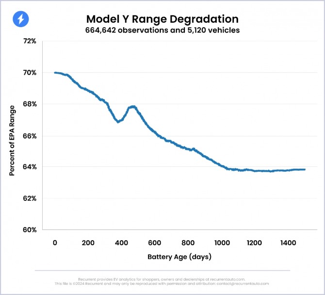 리커런트는 그 결과 “모델3와 모델Y의 주행거리는 운행 기간이 3년을 넘으면 EPA가 해당 모델을 대상으로 인증한 주행거리의 64% 수준으로 떨어지는 것으로 나타났다”고 밝혔다.