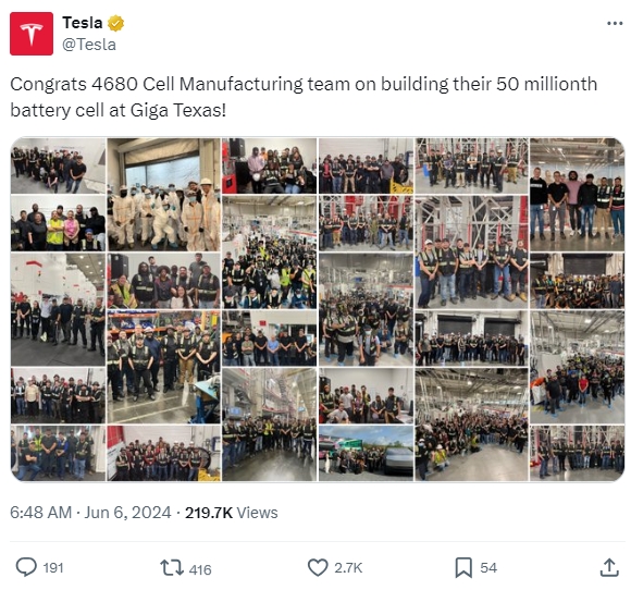 테슬라라티에 따르면 테슬라는 이날 소셜미디어 X에 올린 공지문에서 미국 텍사스주 오스틴의 기가팩토리5에서 5000만번째 4680 배터리 셀이 출고됐다고 발표했다.