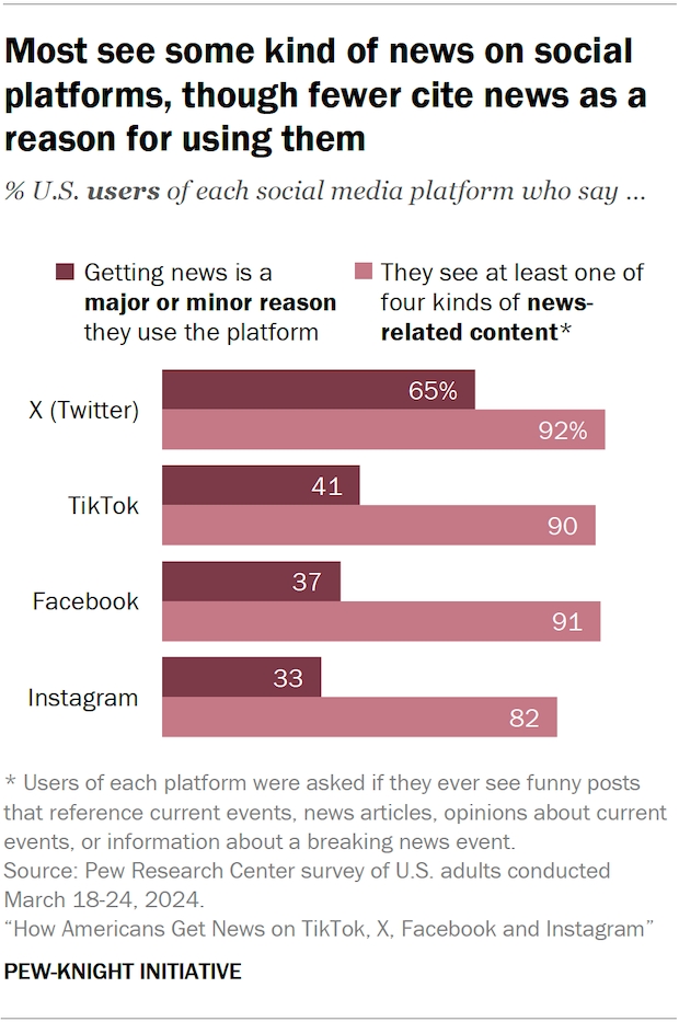 지난해 조사에서는 페이스북 사용자의 31%, 인스타그램 사용자의 16%, 틱톡 사용자의 14%, X 사용자의 12%가 각각 정기적으로 뉴스를 체크할 의도로 로그인한다고 밝혔다.