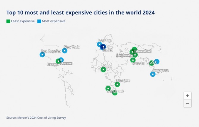 반대로 생계비가 전 세계에서 가장 낮은 도시는 나이지리아 최대 도시 라고스(226위), 나이지리아 수도 아부자(225위), 파키스탄 수도 이슬라마바드(224위), 키르기스스탄 수도 비슈케크(223위), 파키스탄 최대 도시 카라치(222위) 등인 것으로 조사됐다.