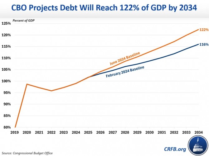 CBS는 이런 추세라면 오는 2034년까지 미국의 국내총생산(GDP) 대비 국가부채 비율이 당초 예상한 116%가 아니라 122%로 급증할 것으로 수정 전망했다.