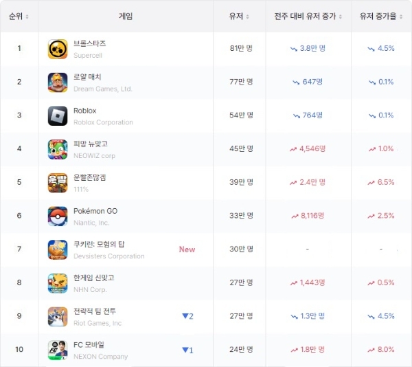 모험의 탑이 새로이 7위에 오름에 따라 전주 10위 '블록 블래스트'가 WAU 21만1213명으로 11위에 자리 잡았다. 12위는 WAU 21만610명의 '냥코 대전쟁', 13위는 WAU 20만905명의 '무한의 계단'이었다.