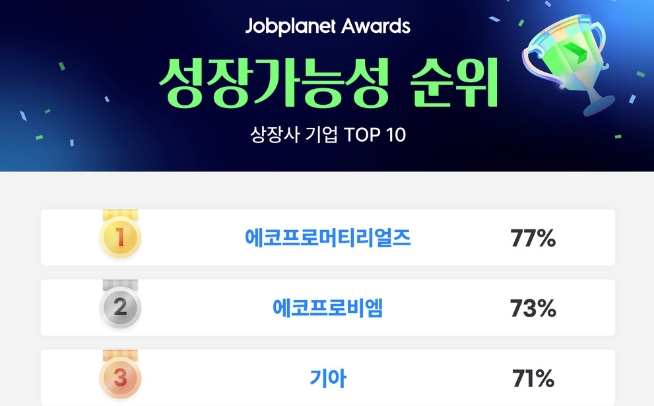 이미지 확대보기잡플래닛이 2023년 7월부터 2024년 6월까지 기업 리뷰 데이터를 토대로 코스닥 및 코스피 상장사를 분석한 결과, 성장가능성 점수가 가장 높은 기업 1위는 '에코프로'의 계열사인 에코프로머티리얼즈로 나타났다.