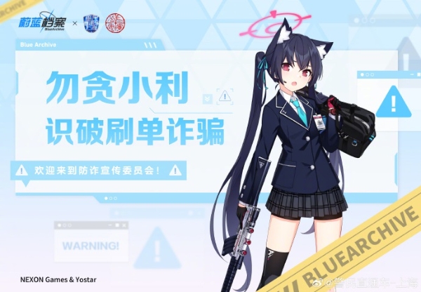 상하이 경찰은 11일, 중국 현지 소셜미디어 웨이보 공식 계정을 통해 "올 여름 블루 아카이브의 키보토스 소녀들과 손을 잡고 통신 사기 방지 캠페인을 전개할 것"이라며 "귀여운 만화, 포스터와 더불어 네티즌 10명에게 기념품을 보내드릴 예정"이라고 공지했다.