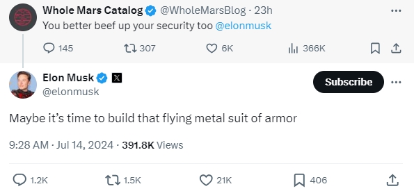 오는 11월 열리는 차기 미국 대통령 선거의 유력한 주자인 도널드 트럼프 전 미국 대통령이 미국 펜실베이니아주 유세장에서 피격되는 사건이 벌어진 직후 트럼프에 대한 전면적인 지지를 선언한 머스크 CEO는 이날 X에 올린 글에서 “날 수 있는 금속 갑옷 같은 것을 만들 때가 아마도 된 것 같다”고 주장했다.