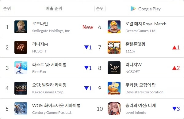 엔씨소프트(NC)의 '리니지M'과 중국 퍼스트펀 '라스트 워: 서바이벌', 카카오게임즈 '오딘: 발할라 라이징'이 그 뒤를 추격하는 가운데 NC의 또다른 MMORPG '리니지W'는 8위, '리니지2M'은 13위에 자리 잡았다.