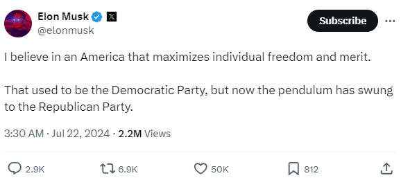 머스크는 미국 공화당 차기 대통령 후보로 선출된 도널드 트럼프 전 미국 대통령에 대한 전폭적인 지지 입장을 트럼프 피격 사건 직후 선언한 바 있다.