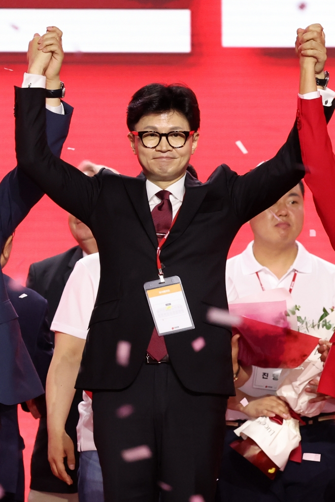 이미지 확대보기한 후보는 23일 경기 고양 킨텍스에서 열린 국민의힘 제4차 전당대회에서 62.84%로 과반을 득표해 당선됐다.