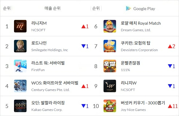 엔씨소프트(NC)의 '리니지M'이 NX3게임즈 '로드나인'에게 내줬던 매출 1위의 자리를 1주 만에 되찾았다. 이 외에도 센추리 게임즈 'WOS: 화이트아웃 서바이벌'과 데브시스터즈 '쿠키런: 모험의 탑' 등이 소폭 상승세를 보였다.