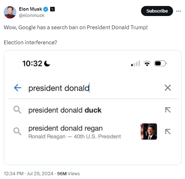 29일(이하 현지시각) CBS뉴스에 따르면 머스크 CEO는 전날 X에 올린 글에서 “구글이 트럼프 전 대통령에 대한 검색을 차단했다”고 밝혔다.