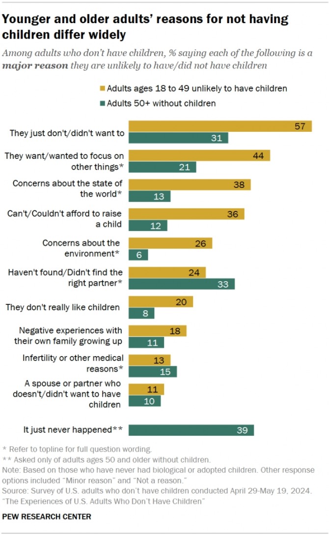 18~49세 그룹에 속한 무자녀 성인의 57%가 전자를, 50세 이상 그룹에 속한 무자녀 성인의 33%가 후자를 이유로 꼽았다.