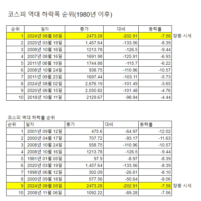 한편, 현재 장중 시세 기준 하락률로는 코스피 시세 공표 후 역대 9위에 해당한다.