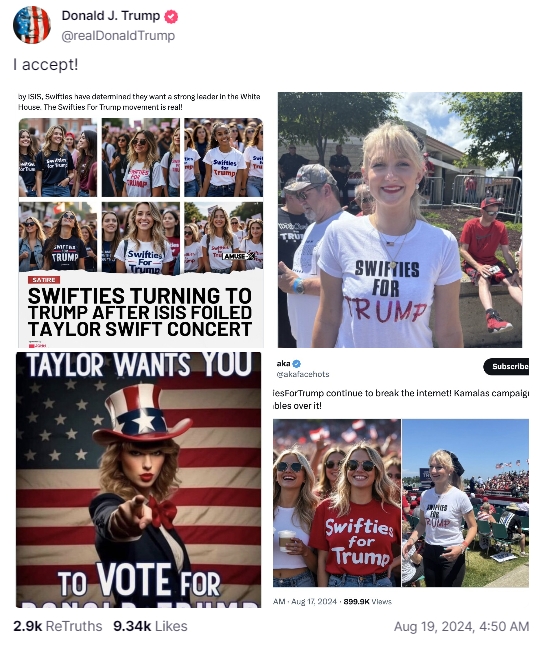 19일(이하 현지시각) 더버지에 따르면 트럼프 후보는 지난 17일 보수성향 소셜미디어 트루스소셜에 올린 글에 스위프트와 스위프트 팬들이 트럼프에 대한 지지를 표시하는 모습을 담은 인공지능(AI) 합성사진을 공유하면서 “여러분의 지지를 받아들이겠다”고 주장했다.