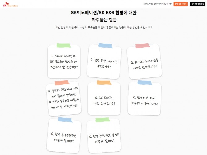이미지 확대보기22일 업계에 따르면 SK이노베이션은 5일부터 자사 홈페이지와 포털 등에 'SK이노베이션·SK E&S 합병' 사이트를 별도로 만들어 운영하고 있다. 합병 통합 시너지, 일반 주주 주요 질문과 답변, 임시 주주총회 소집 등 각종 정보가 제공된다.