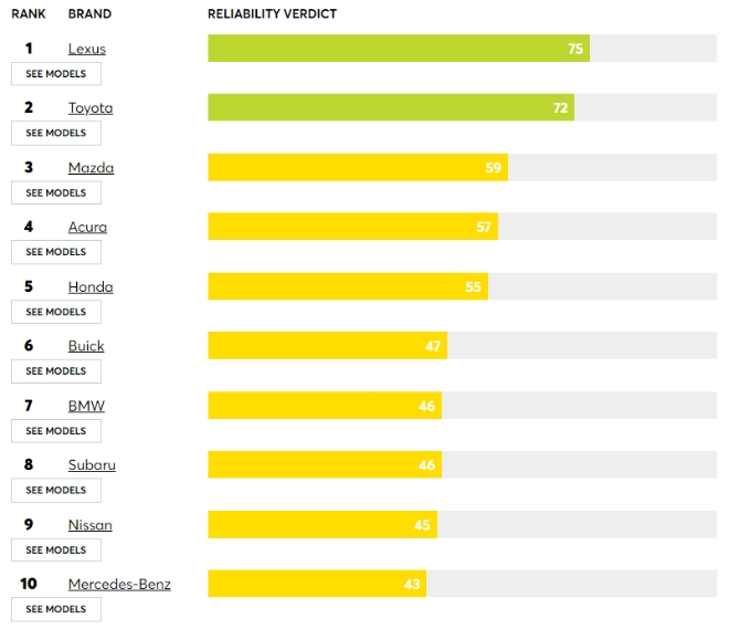 2위는 72점을 기록한 토요타에 돌아갔고 마쓰다(59점)가 3위, 아큐라(57점)가 4위, 혼다(55점)가 5위, 스바루(46점)가 8위, 닛산(45점)가 9위를 기록하는 등 일본 브랜드가 1위에서 10위를 사실상 독차지했다.