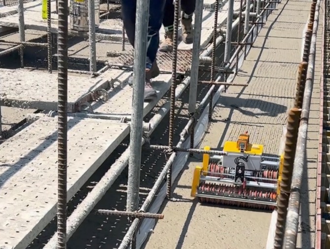 요철생성 로봇은 아직 단단히 굳지 않은 콘크리트 표면에 요철을 생성할 수 있는 특수바퀴를 탑재한 소형 주행 로봇으로, 사람이 직접 작업하는 것보다 작업속도가 현저히 빠르다.