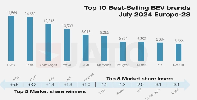 BMW의 전기차 판매량은 지난해 같은 기간에 비해 35%나 증가한 반면에 테슬라는 전년 동기 대비 16%나 감소해 2위로 밀려났다. 이밖에 폭스바겐이 1만2213대로 3위, 볼보가 1만533대로 4위, 아우디가 8618대로 5위를 각각 기록했다.
