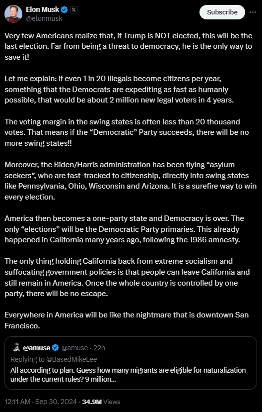 뉴스위크에 따르면 머스크 CEO는 이날 자신이 소유한 소셜미디어 X에 올린 장문의 글에서 “대다수 미국인들이 트럼프가 이번에 선출되지 않으면 이번 대선이 마지막 대선이 될 것이란 사실을 모르고 있다”면서 “트럼프는 민주주의를 위협하는 인물이 아니라 오히려 민주주의를 구할 유일한 적임자”라고 주장했다.