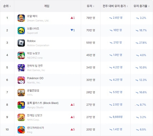 같은 주 로얄 매치, 로블록스보다 높은 매출을 거둔 세 게임의 WAU와 전주 대비 변화율은 △1위 퍼스트펀 '라스트 워 서바이벌' 14만36명(-8.31%) △2위 엔씨소프트 '리니지M' 13만5667명(+18.36%) △3위 센추리 게임즈 'WOS: 화이트아웃 서바이벌' 10만6767명(-1.81%)로 집계됐다.