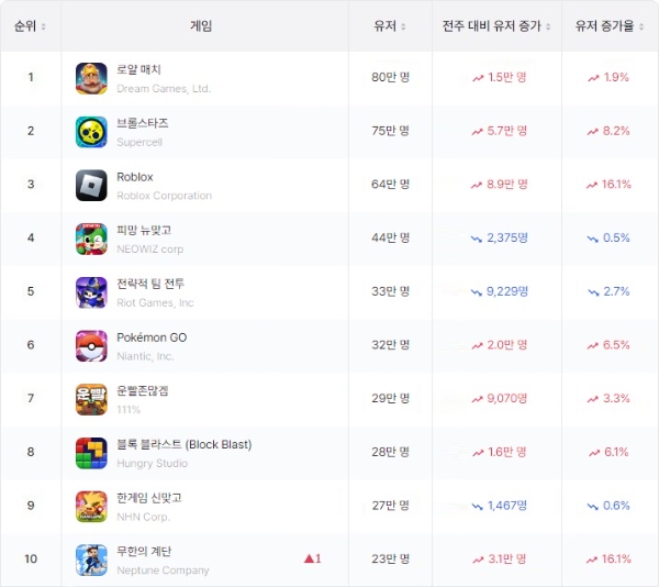 구글 플레이스토어 10월 1주차 WAU 톱10 게임 중 로얄 매치 다음으로 높은 수익을 거둔 것은 같은 주 매출 7위를 기록한 '브롤스타즈'였다. 이외 '로블록스'가 11위, '운빨존많겜'이 21위를 차지했다.