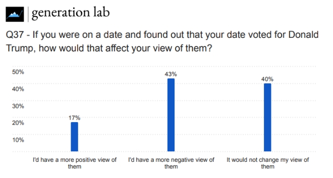 제너레이션랩에 따르면 이번 조사에 응한 18~34세 유권자를 대상으로 이성교제 가능성이 있는 상대방이 트럼프 후보를 지지하는 사람인 것으로 확인될 경우 여전히 교제 의향이 있느냐고 물은 결과 응답자의 43%가 “트럼프에 대한 인식이 부정적이어서 트럼프 지지자와는 교제할 가능성이 적다”고 밝혔다.