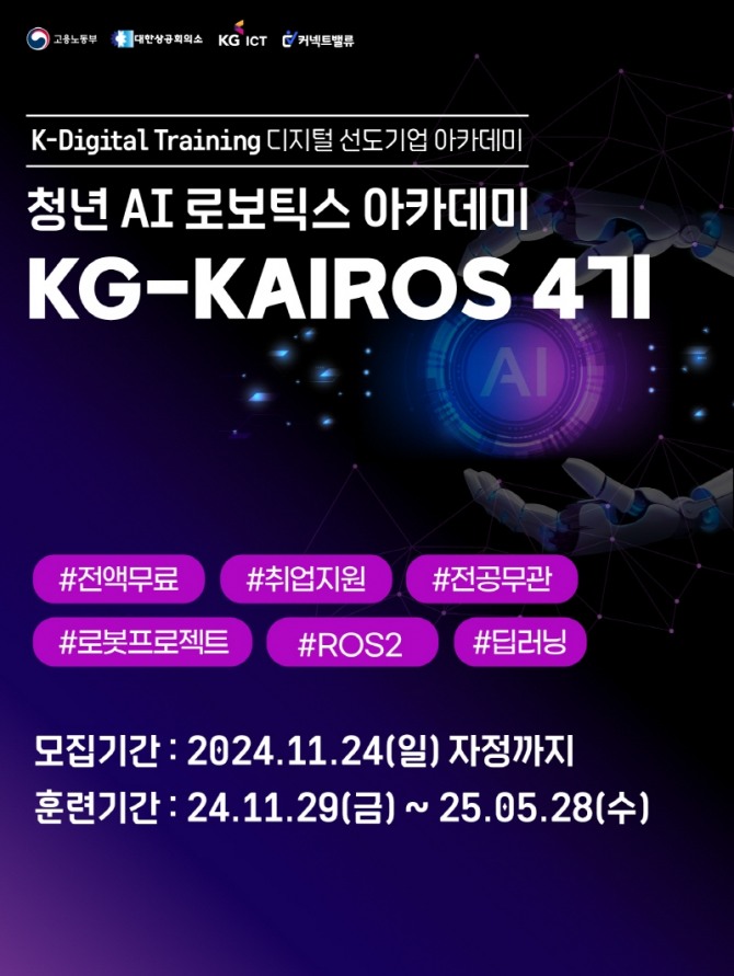 현재 KG 카이로스는 4기 훈련생을 모집 중이다. 이번 과정은 11월 29일부터 내년 5월 28일까지 서울 종로에 위치한 커넥트밸류러닝센터에서 오프라인 수업으로 진행된다. 국민내일배움카드 지원으로 수강료 부담 없이 참여할 수 있다. 참가자에게는 별도의 훈련수당과 장학금, 로봇 장비 및 노트북 등 필요한 교보재가 100% 지원된다.