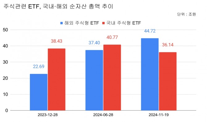 20일 글로벌이코노믹이 집계한 바에 따르면, 국내 ETF 중 해외 주식에 투자한 ETF의 순자산 규모는 지난 19일 기준 44조7241억원을 기록해 한국 주식 ETF 순자산(36조1373억원)을 압도적으로 넘어섰다.