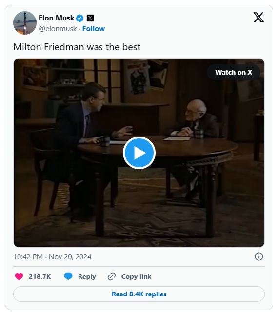 21일(이하 현지 시각) 폭스뉴스에 따르면 머스크 CEO는 전날 X에 올린 글에서 프리드먼의 생전 인터뷰 영상을 공유하며 “밀턴 프리드먼이 최고였다”고 밝혔다.