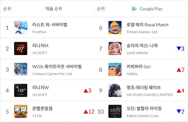 이미지 확대보기엔씨소프트(NC)의 '리니지W'와 111%의 '운빨존많겜'이 업데이트에 힘입어 국내 구글 플레이스토어 매출 톱5에 복귀했다.