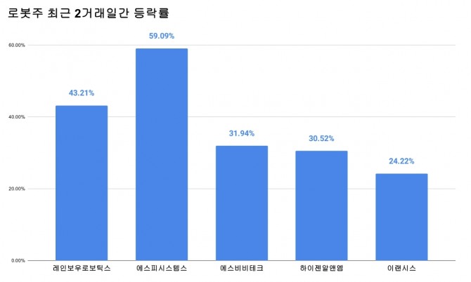 같은 기간동안 로봇 관련주인 에스피시스템스(59.09%), 에스비비테크(31.94%), 하이젠알엔엠(30.52%), 이랜시스(24.22%) 등 도 일제히 급등했다.