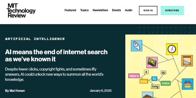 이미지 확대보기세계적인 공과 전문대학인 미국 매사추세츠공과대학(MIT)이 발간하는 IT 전문매체인 MIT 테크놀로지 리뷰는 최근 호에서 “기존의 ‘키워드 검색’과 ‘블루 링크’ 중심의 결과 제공 방식은 사라지고, 이제는 실시간 정보를 기반으로 한 ‘대화형 검색’ 시대가 열리고 있다”고 진단했다.