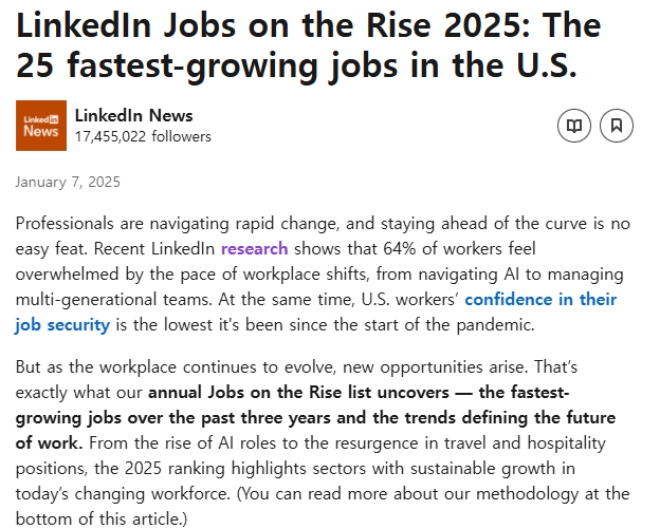 링크드인이 펴낸 ‘2025년 가장 유망한 직업’ 보고서에 따르면 올해 가장 빠르게 성장할 것으로 예상되는 직업 순위에서 AI 관련 직종이 상위권을 싹쓸이한 가운데 ‘AI 엔지니어’ ‘AI 컨설턴트’가 각각 1위와 2위에 올랐다.