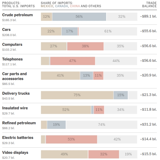 NYT에 따르면 국가가 아니라 들여오는 품목을 기준으로 살펴봐도 멕시코, 중국, 캐나다산 수입품의 비중이 압도적으로 큰 것으로 나타났다.