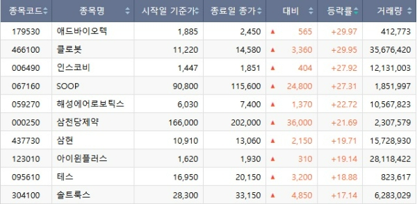 이는 코스닥 주식 중 '애드바이오텍', '클로봇'에 이어 3위, 코스피와 코넥스까지 국내 주식 전체로 확대하면 인스코비까지 포함해 4위에 해당하는 기록이다.