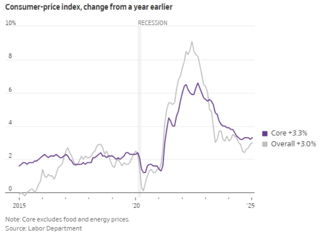 이미지 확대보기12일(현지시각) 월스트리트저널(WSJ)에 따르면 미 노동부는 1월 소비자물가지수(CPI)가 전년 동월 대비 3.0% 상승했다고 이날 발표했다. 이는 시장 예상치였던 2.9%를 웃도는 수준으로 지난해 12월의 2.9%보다 오름폭이 확대됐다.